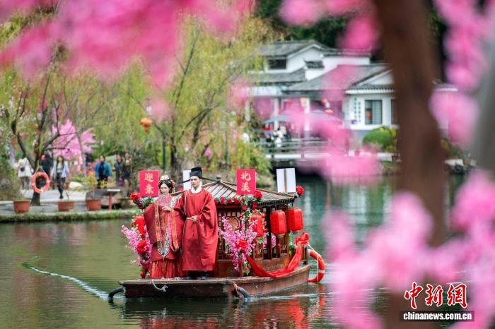 2月27日,第十五屆永春桃花季古風(fēng)姻緣會(huì)系列活動(dòng)在福建永春縣啟動(dòng)。圖為游船上的新人??祽c平 攝