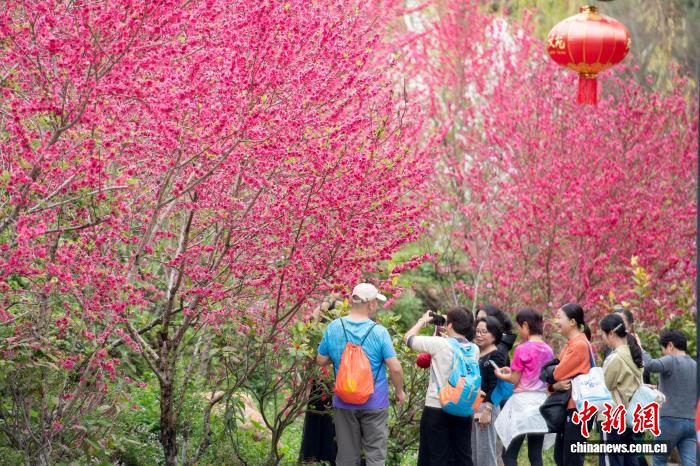 “福建最美鄉(xiāng)村”永春縣北溪村桃花迎春綻放。圖為2月27日,游客在永春縣北溪文苑游玩賞花??祽c平 攝
