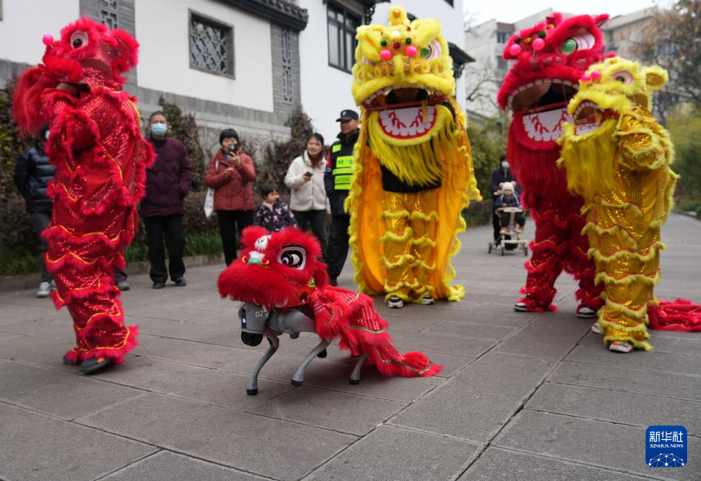 2月11日,在浙江杭州市西湖區(qū)北山街道元宵文化廟會活動中,機(jī)器狗與演員一起為社區(qū)居民進(jìn)行舞獅表演。