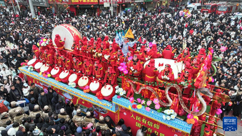 2月9日,在甘肅省平?jīng)鍪星f浪縣“龍騰盛世·歡樂莊浪”第二十一屆民間文化藝術(shù)節(jié)上,群眾觀看巡游的彩車(無人機(jī)照片)。