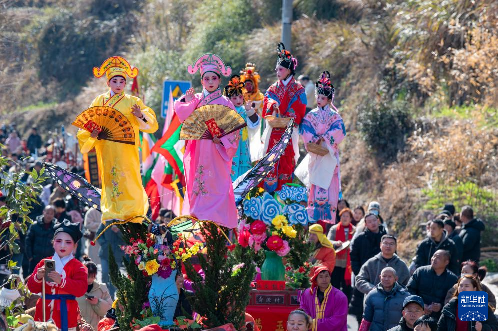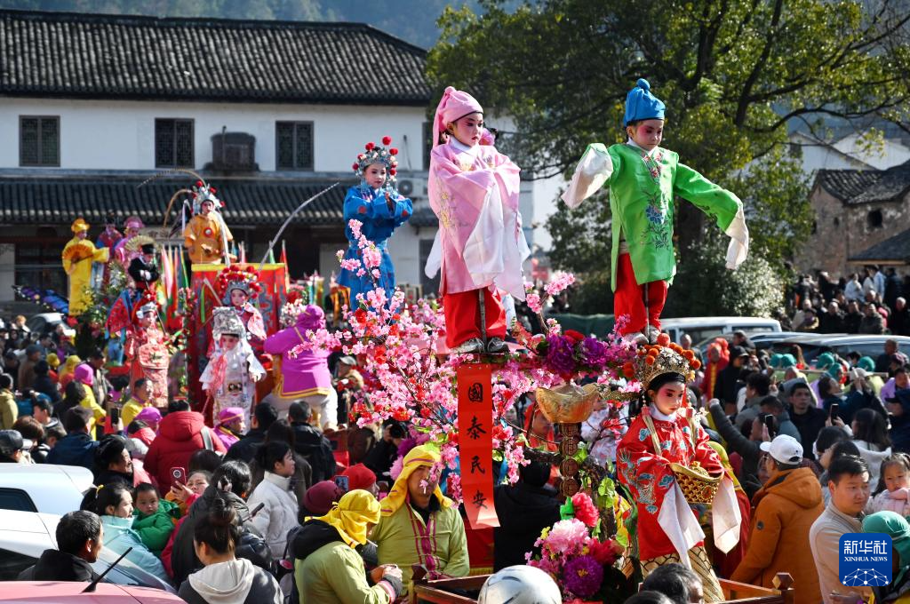 2月10日,浙江省武義縣俞源古村舉行“擎臺閣”迎元宵大型民俗展演活動,童男童女扮演的戲曲人物在村中巡游。