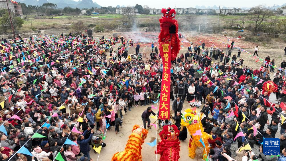2月9日,廣西柳州市柳江區(qū)進(jìn)德鎮(zhèn)四連村土垢屯,村民在客家“上燈節(jié)”活動上進(jìn)行舞獅表演(無人機(jī)照片)。