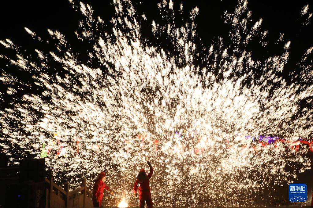 2月10日晚,民間藝人在河南省焦作市溫縣陳家溝景區(qū)表演“打鐵花”。
