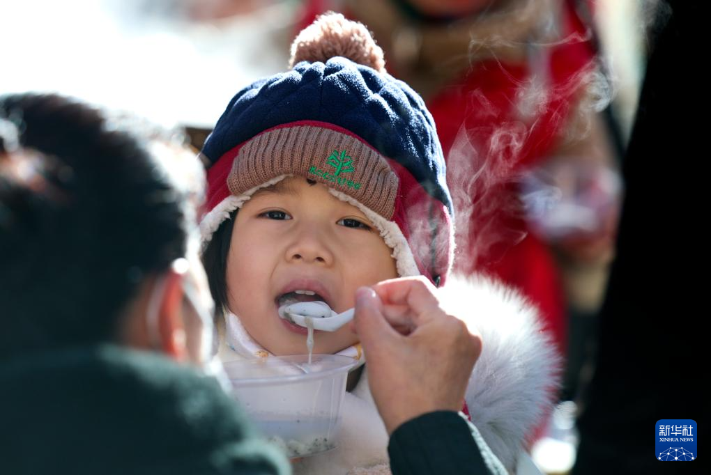2月11日,在烏魯木齊大巴扎步行街,小朋友在品嘗湯圓。
