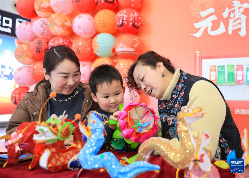 2月11日,旅客在南京南站舉辦的迎接元宵節(jié)活動上體驗(yàn)制作花燈。
