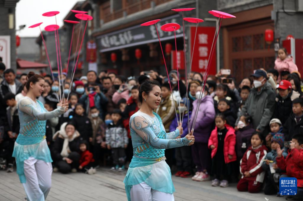 2月11日,在河北省滄州市運(yùn)河區(qū)南川老街景區(qū),民間藝人為游客表演雜技節(jié)目《轉(zhuǎn)花碟》。