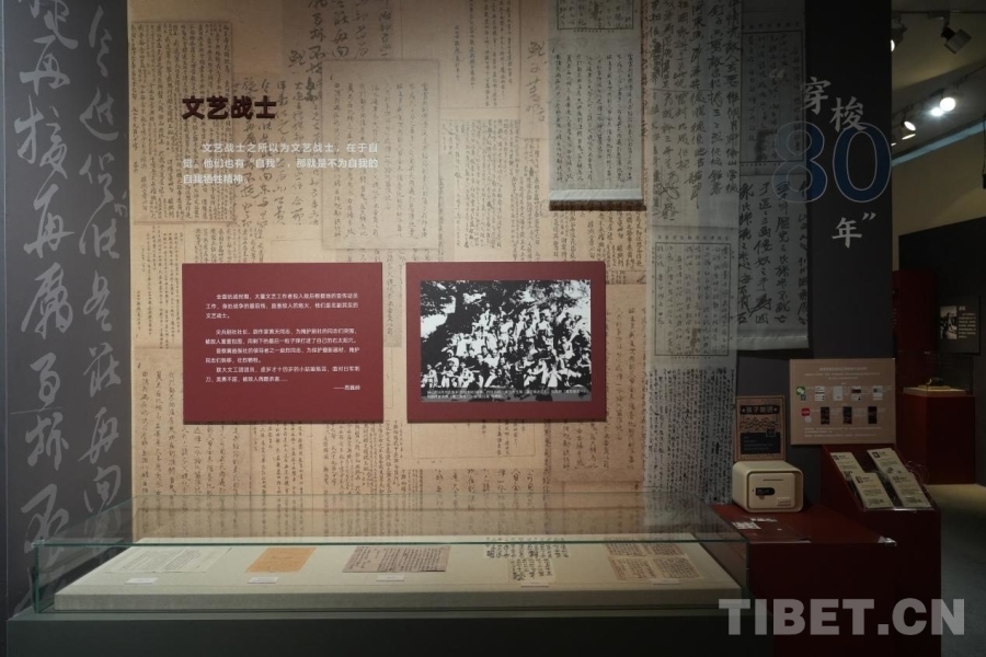 圖為中國現(xiàn)代文學館內,“山河跡憶——手稿里的抗戰(zhàn)中國”展覽中“文藝戰(zhàn)士”展示墻 攝影:郭睿佳