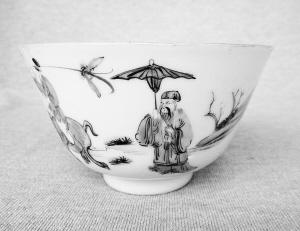 在茶盅底部,有大清光緒年制的底款,看來正制作于該時(shí)期。光緒年間,正是我國最后一個封建王朝清朝的黃昏之旅,國家內(nèi)憂外患,官員自保不暇,百姓人人自危,似在走向窮途末路。制作茶盅的匠人,大概也希望能像畫面中的老者一樣,回鄉(xiāng)隱居,在山間林舍終老一生。但對于受官府管控的皇家官窯工匠來說,這樣的愿望,無異是一種可望而不即的奢望。