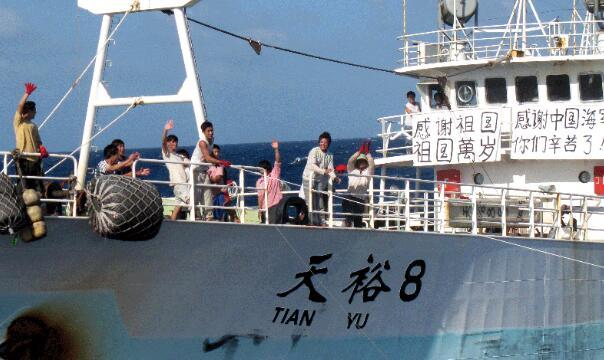 看到??谂?,“天裕8號”船員就像見到了久違的親人,紛紛走上甲板,歡呼著向??谂灀]手致意,并在船上升起一面鮮艷的五星紅旗。他們年齡大約在二十歲左右,在甲板上行走如飛,如履平地一般。
