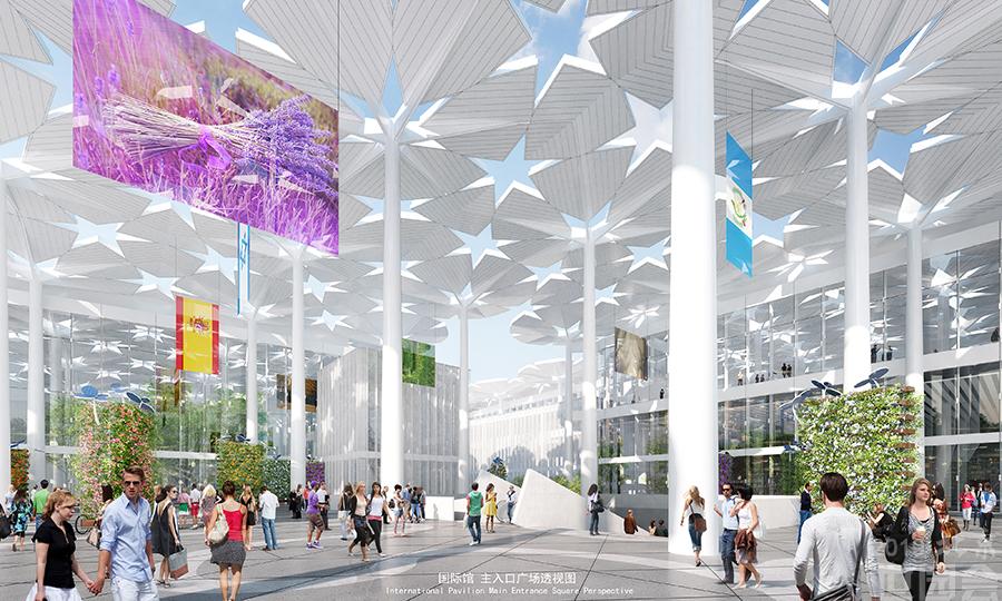 此外,國際館利用建筑遮陽、自然通風(fēng)、太陽能光伏發(fā)電、蒸發(fā)冷卻降溫、滴灌技術(shù)和雨水回收利用等可持續(xù)技術(shù),成為一座綠色、環(huán)保的低能耗建筑。外立面采用玻璃幕墻,并在頂面設(shè)計了天窗,最大限度保證場館的自然采光和通透性?;▊愕牧⒅蓪⑹占菝嬗晁?,使其滲入蓄水池,當雨水過多時,將會流入排水溝,用于景觀用水、綠化用水、路面沖洗等。在花傘的上方采用新型光伏發(fā)電材料,提高光伏發(fā)電效率,用于整個建筑的內(nèi)照明、動力等用能需求。