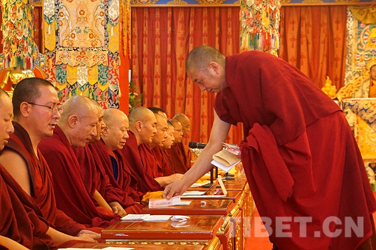 誦經(jīng)結(jié)束后,土多申格副院長帶領(lǐng)3名經(jīng)師代表和3名學(xué)員代表,虔誠地向十一世班禪敬獻(xiàn)曼扎、佛像、佛塔、佛經(jīng),進(jìn)行佛事禮拜。班禪微笑接過供奉,為他們摸頂賜福。