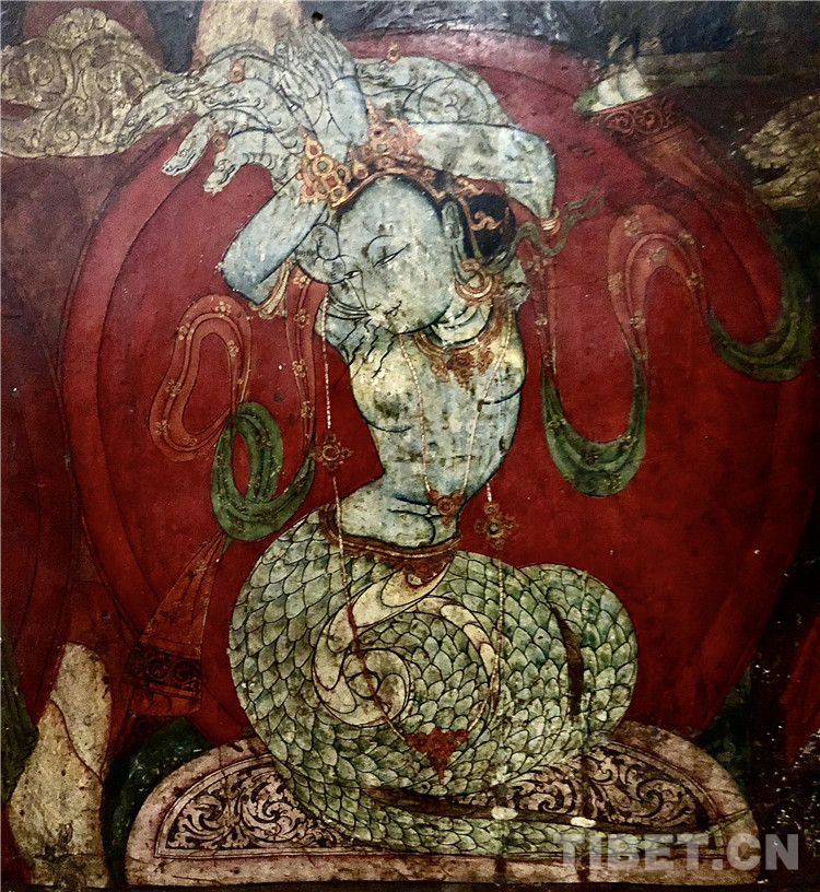 龍女,亦稱為“魯”或“魯女”,是一種上身為人、下身為龍的精靈。古格壁畫中這種人形龍造型的龍女,大都面容嬌美,扭動的身姿婀娜妖嬈,盤曲而坐,尾部上揚(yáng),有的頭頂還飾有數(shù)條小龍。相傳龍女棲息于水中、灶頭、古樹間,為所有動物的首領(lǐng)。上圖中,龍女青藍(lán)色的身體映襯在紅色的背景中,冷暖相宜,異常美艷動人。其他幾幅都以白色或肉色為主調(diào),在繁復(fù)的深色環(huán)境圖中顯得很打眼,如下面這兩幅。