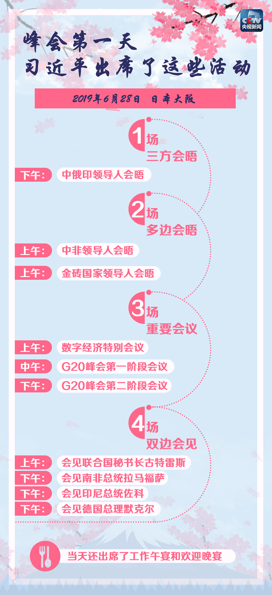 6月29日是G20大阪峰會(huì)的最后一天。習(xí)近平主席將繼續(xù)出席G20大阪峰會(huì)后續(xù)階段的會(huì)議,并同多國領(lǐng)導(dǎo)人舉行雙邊會(huì)見,其中與美國總統(tǒng)特朗普的會(huì)晤也將于當(dāng)天舉行。請(qǐng)繼續(xù)關(guān)注《時(shí)政新聞眼》。