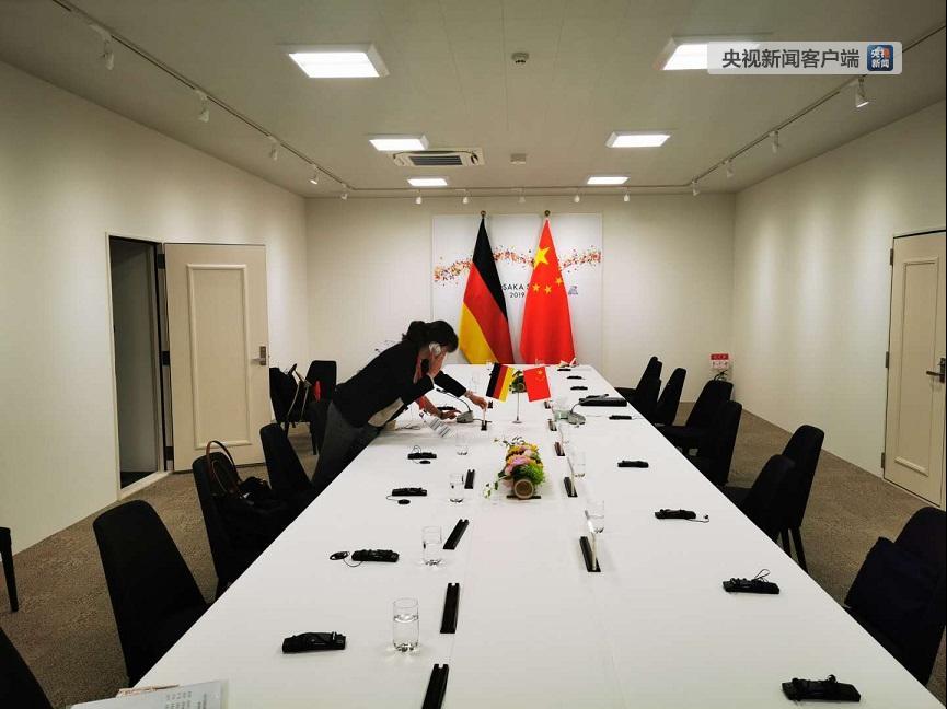 工作人員正在布置中德領(lǐng)導(dǎo)人會(huì)晤會(huì)場。(央視記者荊偉拍攝)