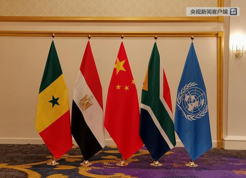 現(xiàn)場擺放的中非領(lǐng)導(dǎo)人會(huì)晤五方旗幟。(央視記者楊立峰拍攝)