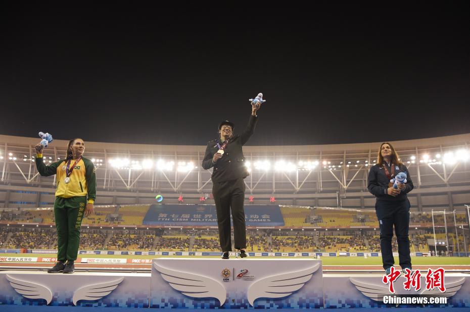 10月24日晚,第七屆世界軍人運(yùn)動會女子鐵餅決賽在湖北省武漢市舉行,中國選手馮彬以64米83奪得冠軍。圖為中國選手馮彬(中)奪得冠軍,巴西選手馬丁斯(左)獲得亞軍,希臘選手阿娜古諾斯托普洛獲得第三名。中新社記者 侯宇 攝