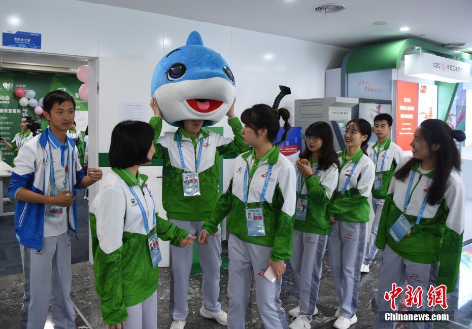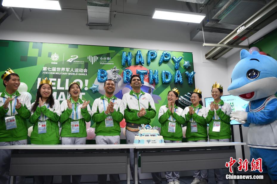 10月24日,幾位在第七屆世界軍人運(yùn)動(dòng)會(huì)舉辦期間迎來生日的志愿者“小水杉”在主媒體中心內(nèi)的“志愿者之家”過集體生日。圖為軍運(yùn)會(huì)吉祥物“兵兵”向過生日的志愿者們送上小禮物。中新社記者 侯宇 攝