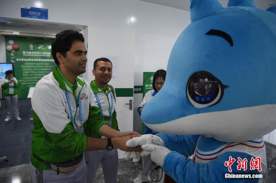 10月24日,幾位在第七屆世界軍人運(yùn)動(dòng)會(huì)舉辦期間迎來生日的志愿者“小水杉”在主媒體中心內(nèi)的“志愿者之家”過集體生日。圖為來自埃及的志愿者艾爾侯賽因與軍運(yùn)會(huì)吉祥物“兵兵”交流。中新社記者 侯宇 攝