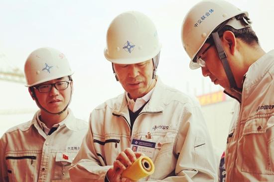 港珠澳大橋島隧工程項目總經(jīng)理兼總工程師林鳴與同事一起討論施工細(xì)節(jié)。(圖片來源:新華視點(diǎn))