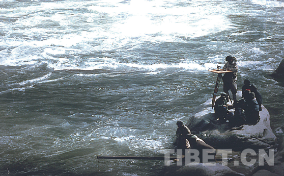 多年后說到大江測流的驚險場面,還會讓當(dāng)事人章銘陶十二分自豪。是在峽谷中段八玉村附近江面,測得雅魯藏布江最大流速為每秒16米,平均流量4425秒立方!這一數(shù)據(jù)后被廣泛引用,卻未必知道如何得來。當(dāng)時的測量方法還比較原始,全靠人力手工。該段江面寬度超過百米,需要把木制浮標(biāo)拋至江心急流處,楊逸疇試了幾次沒能成功,想當(dāng)年他可是南京大學(xué)投擲標(biāo)槍的冠軍哪!于是身形矯健的章銘陶上陣,攀上溜索,把自己懸空固定在江心上方,再按照岸邊人揮旗示意,朝著滔滔急流一一投放木塊,關(guān)志華負(fù)責(zé)掐表。這一過程想必持續(xù)太久,以至于引起對岸當(dāng)?shù)厝说淖⒁猓河袃蓚€人駐足觀望,定是以為受困于溜索,鑒于類似事故偶有發(fā)生,遂急奔下來意在施救。近前時又見懸于溜索之人連連擺手,方才弄明白,原來人家是在工作。