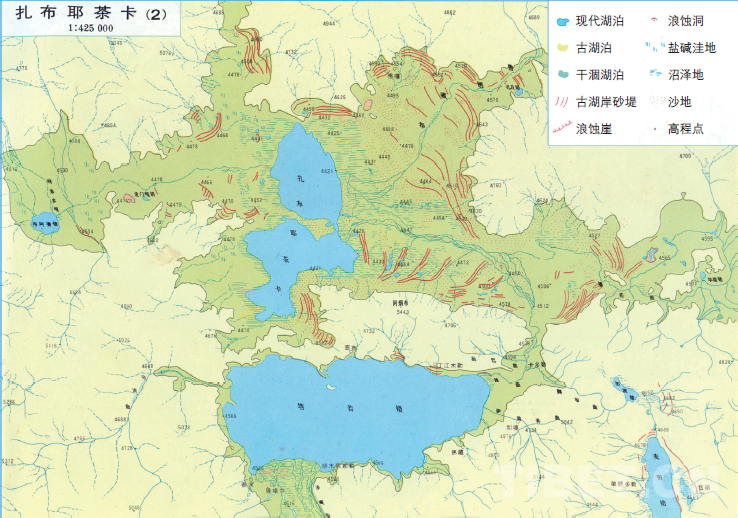 扎布耶茶卡也是藏北高原湖泊退縮痕跡保留最完整的湖泊之一,東部有12~15條古湖岸沙堤,退縮距離達(dá)35~40公里,是藏北高原所有湖泊中退縮距離最長的,也是藏北高原南部最低的湖泊,屬構(gòu)造陷落湖。最高古湖岸砂堤高出現(xiàn)代湖面119米。