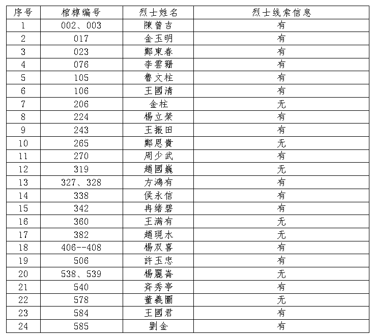 從今天起,我們?yōu)樽?014年起遷回沈陽安葬的在韓志愿軍烈士遺骸尋找親屬。慰籍烈士的英靈,告慰烈士的親人?;顒悠诖膮⑴c,期待著您的幫助。希望大家共同努力讓英烈事跡永遠流傳,精神流芳千古。