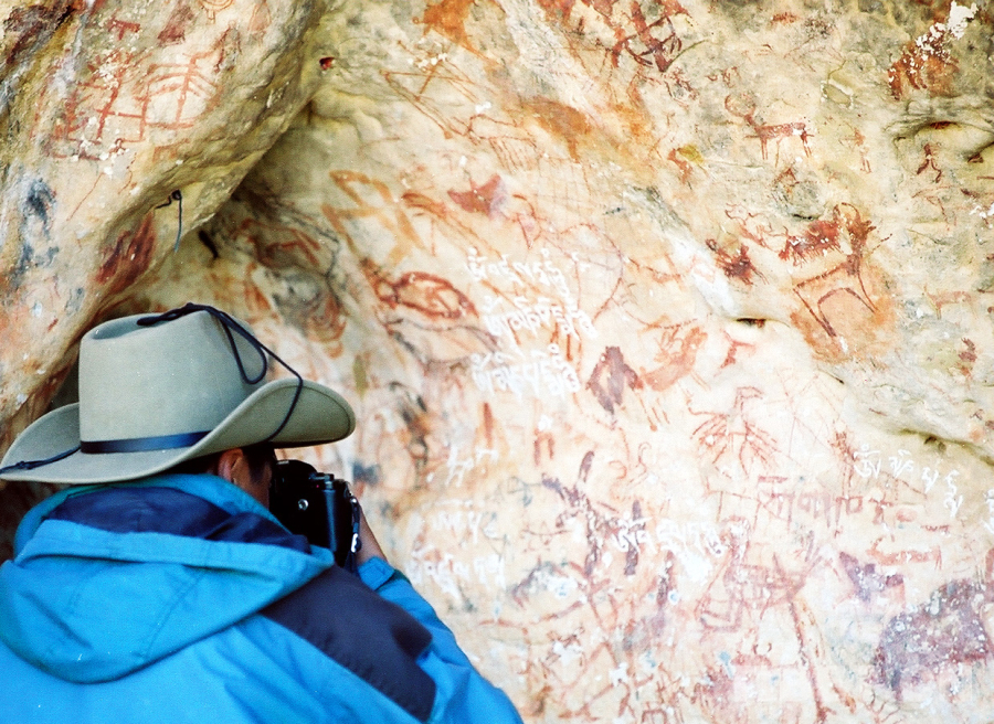 圖為科考人員在對納木錯扎西半島洞穴巖畫進行考察拍照(唐召明2001年攝)