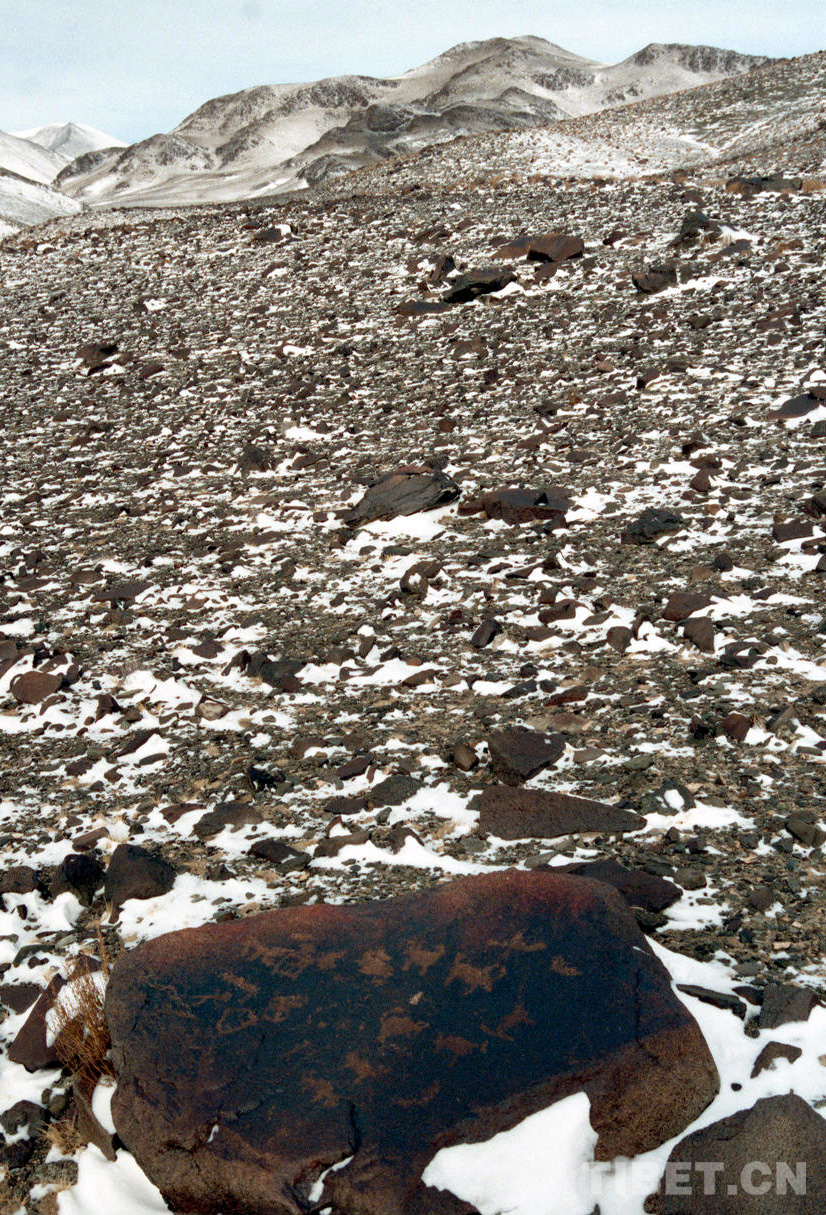 無獨有偶。在后來的幾天里,我們在那曲地區(qū)(現(xiàn)那曲市)尼瑪縣榮瑪鄉(xiāng)加林山俄東溝也發(fā)現(xiàn)了大量石頭巖畫。