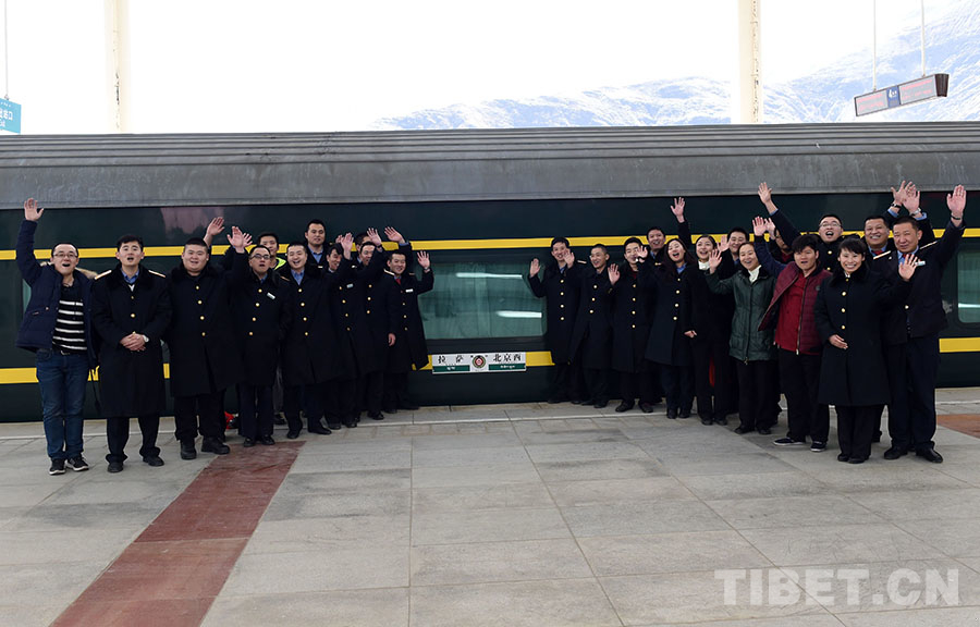 這是京藏列車二組列車員在拉薩站發(fā)車前,與自己朝夕相伴9年半的列車拍照留念(唐召明2016年2月3日攝)