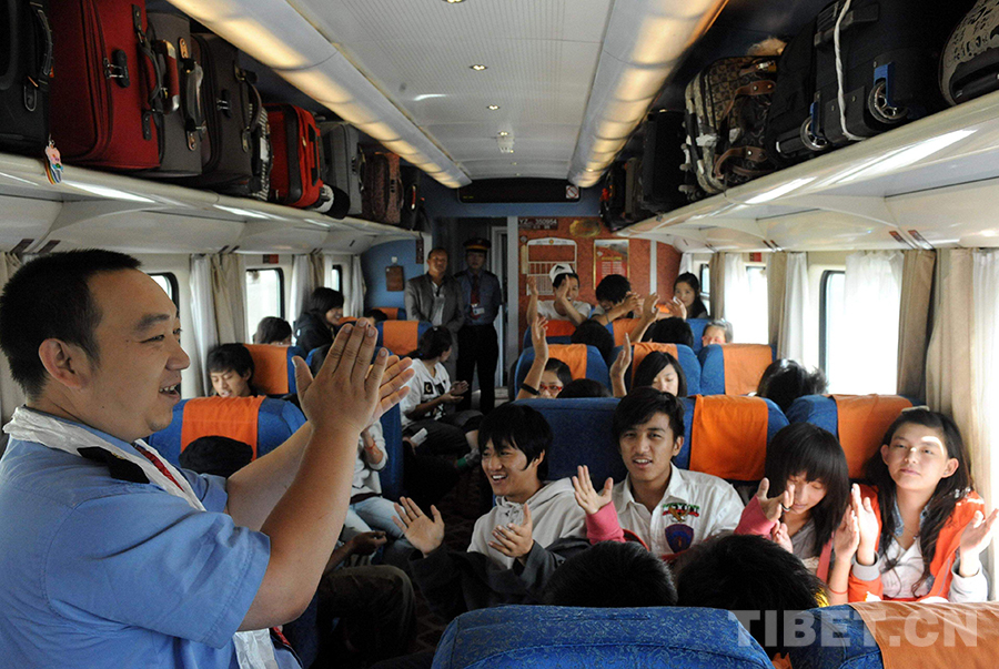 這是被稱為“快樂(lè)大叔”的共產(chǎn)黨員、京藏列車三組列車員鄭志剛(左一),在北京開往拉薩的列車上,與乘車藏族學(xué)生一起歡歌(唐召明2010年7月4日攝)