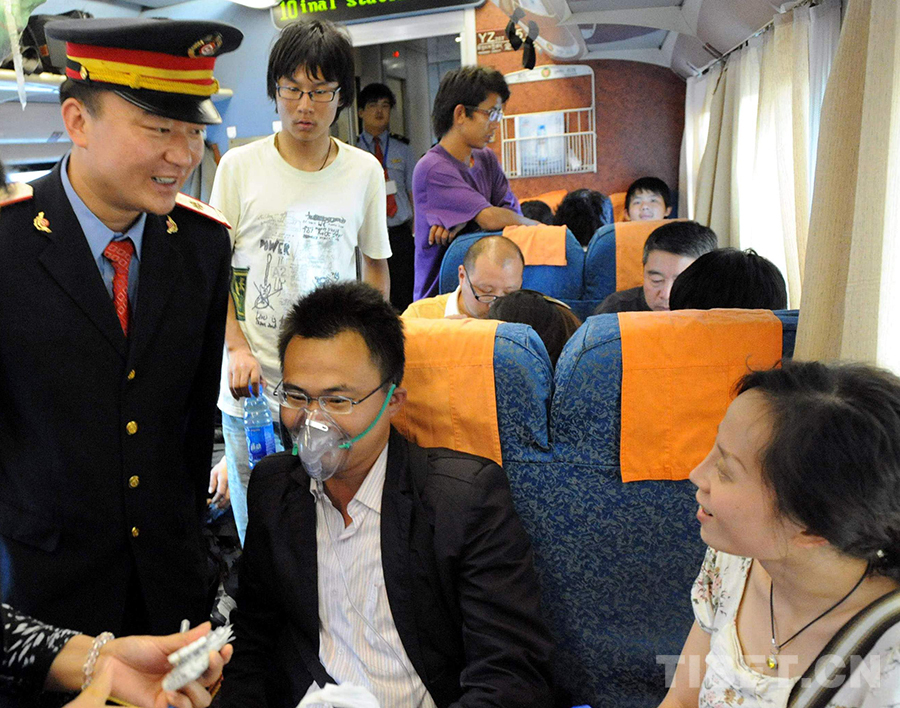 這是夫妻同在京藏列車上工作、被人們親切稱為“高飛的比翼鳥”的京藏列車十一組列車長(zhǎng)王寶山(左一)為身體不適的旅客送上氧氣面罩,幫助其吸氧(唐召明2010年8月22日攝)