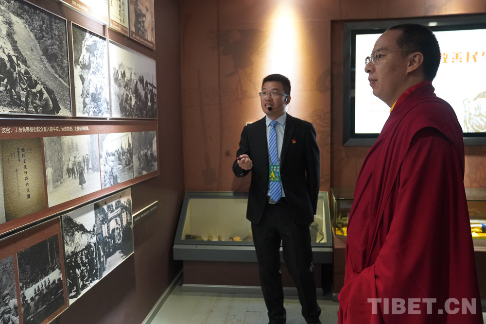 十一世班禪一路緩步前行,時而抬頭仰望、時而俯身凝視。在講解員的介紹下,從和平解放、民主改革,到社會主義建設(shè)、改革開放,再到新時代,依次參觀了各展區(qū)。