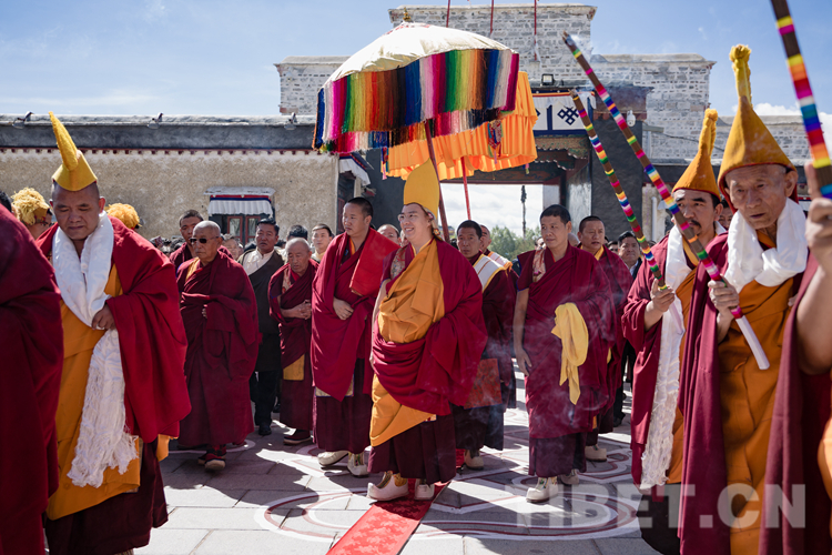 在桑煙裊裊、法號(hào)齊鳴中,十一世班禪在扎什倫布寺僧人儀仗隊(duì)簇?fù)硐戮彶阶哌M(jìn)措欽大殿,邊走邊向僧俗信眾揮手致意,回應(yīng)熱切期盼。