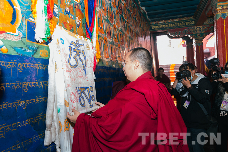 圖為十一世班禪在措欽大殿向宗喀巴大師殊勝壁畫(huà)敬獻(xiàn)身語(yǔ)意種子的符箓 攝影:鄭朔