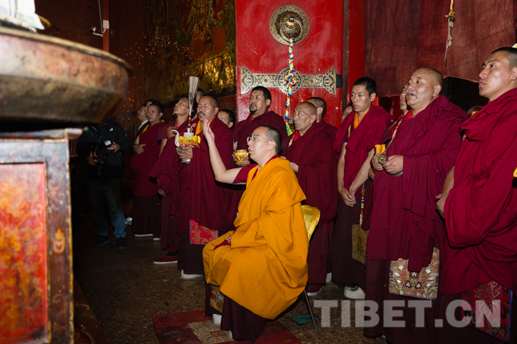 下午,在拉讓日光殿內(nèi),十一世班禪登上寶座接受扎什倫布寺僧眾的朝拜,為他們摸頂賜福,并帶領(lǐng)僧眾誦經(jīng)祈禱,渾厚的誦經(jīng)聲響徹殿內(nèi)。