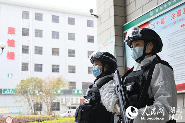 特警隊(duì)員熊吉平、孫思婕在襄陽(yáng)市中心醫(yī)院發(fā)熱門(mén)診外值守(襄陽(yáng)特警供圖)