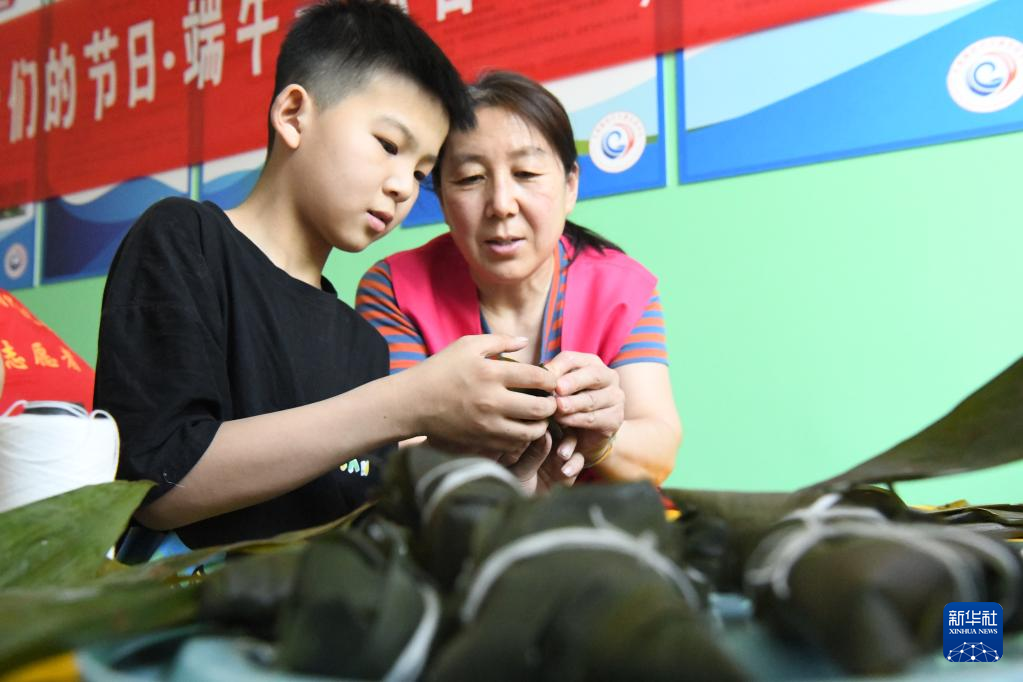 5月28日,在河北省邯鄲市廣平縣,志愿者陪留守兒童一起包粽子。新華社發(fā)(程學虎 攝)