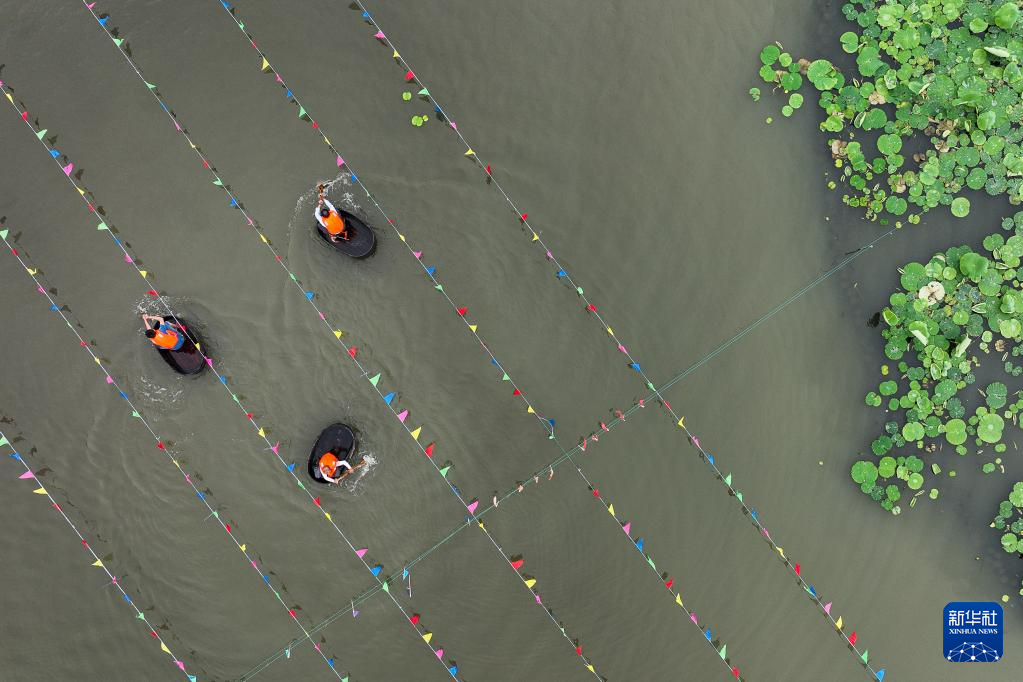 5月28日,在浙江省湖州市吳興區(qū),當?shù)卮迕裨诤商羶?nèi)參加端午劃菱桶趣味活動(無人機照片)。新華社發(fā)(伊凡 攝)