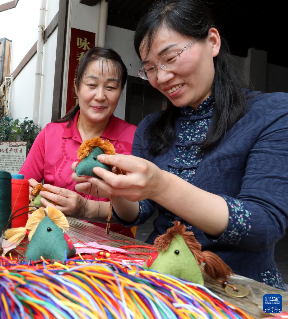 5月28日,安徽省淮北市香包制作手藝人楊海玲(右)在工作室?guī)ьI工人趕制訂單,制作傳統(tǒng)香包。新華社發(fā)(李鑫 攝)