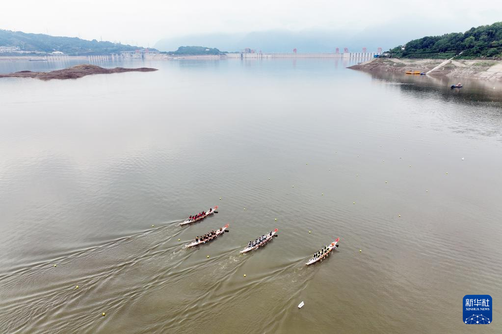 5月28日,在湖北省宜昌市秭歸縣,龍舟選手在三峽大壩附近水域進行龍舟比賽(無人機照片)。新華社發(fā)(王輝富 攝)