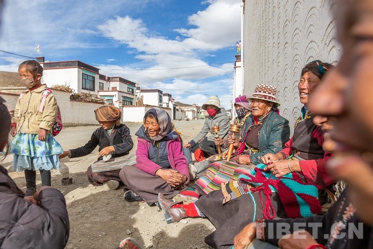 圖為倫布雪鄉(xiāng)蘇格村村民圍坐在一起聊天編織 攝影:趙耀