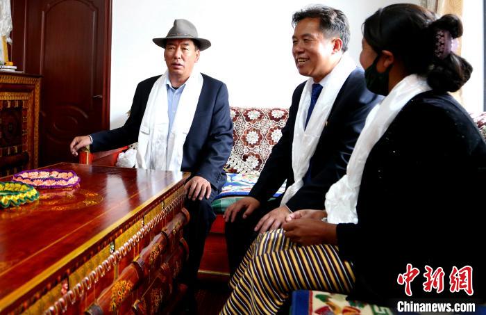 圖為瓊結(jié)縣相關(guān)負(fù)責(zé)人向卓嘎老人的孫女洛桑曲珍(右一)了解在校學(xué)習(xí)情況。倫珠澤仁 攝