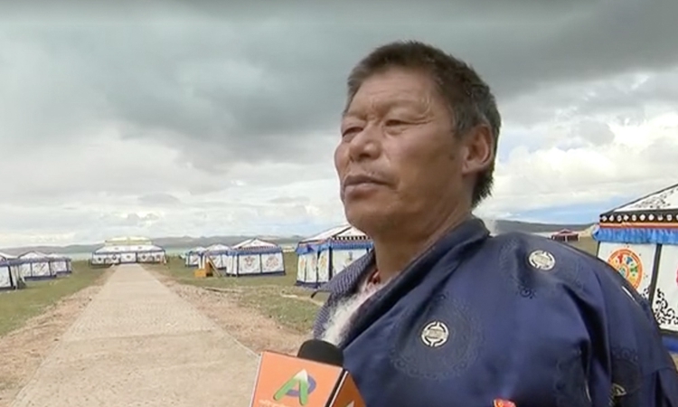 圖為羅次在“移動(dòng)帳篷”前接受采訪 圖片來源那曲廣播電視臺(tái)