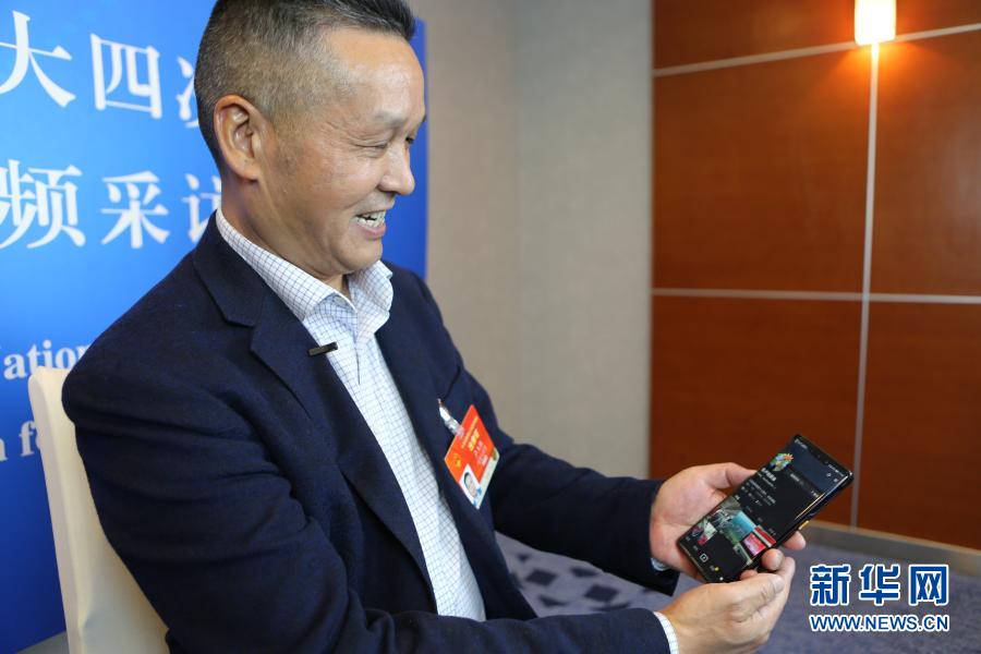 3月3日,全國(guó)人大代表、福建永泰縣希安油茶專業(yè)合作社負(fù)責(zé)人盧玉勝在駐地接受采訪時(shí)展示他為宣傳油茶開通的社交媒體賬號(hào)。新華社記者 吳雨 攝