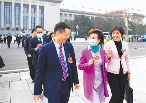 3月8日,十三屆全國人大四次會議在北京人民大會堂舉行第二次全體會議。會后,人大廣東代表團(tuán)代表陳旭斌(左)、程萍(中)、郭姣(右)就宏觀政策保持穩(wěn)定等話題繼續(xù)交流。經(jīng)濟(jì)日報-中國經(jīng)濟(jì)網(wǎng)記者 李景錄攝