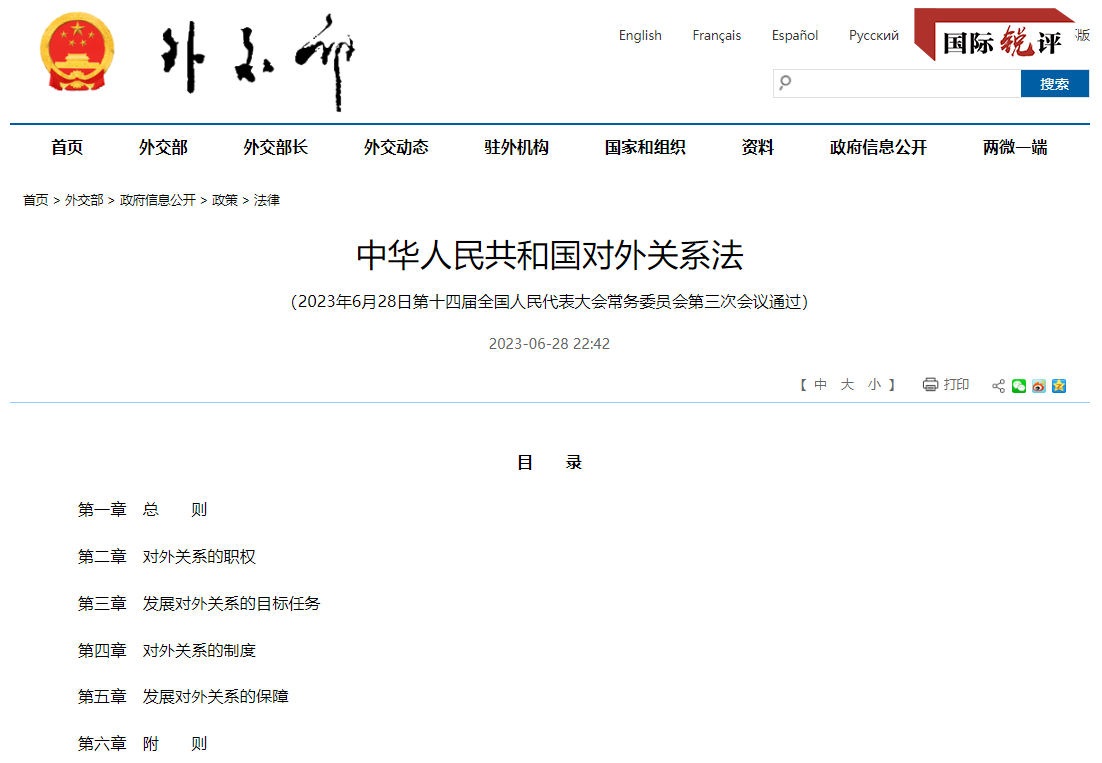 從7月1日起,《中華人民共和國對外關(guān)系法》正式施行。這是新中國首部基礎(chǔ)性、綱領(lǐng)性、綜合性對外關(guān)系法律,為中國與世界交往提供了更完善的法律遵循。它將讓世界更好地了解中國,了解中國推動構(gòu)建人類命運共同體的堅定信念,了解中國維護國家主權(quán)、安全和發(fā)展利益以及國際公平正義的決心和擔(dān)當(dāng)。新加坡《聯(lián)合早報》引述專家的話評價說,這部法律展現(xiàn)了中國外交政策原則,將中國執(zhí)政黨領(lǐng)導(dǎo)外交事務(wù)的論述以法律形式進行了確立。