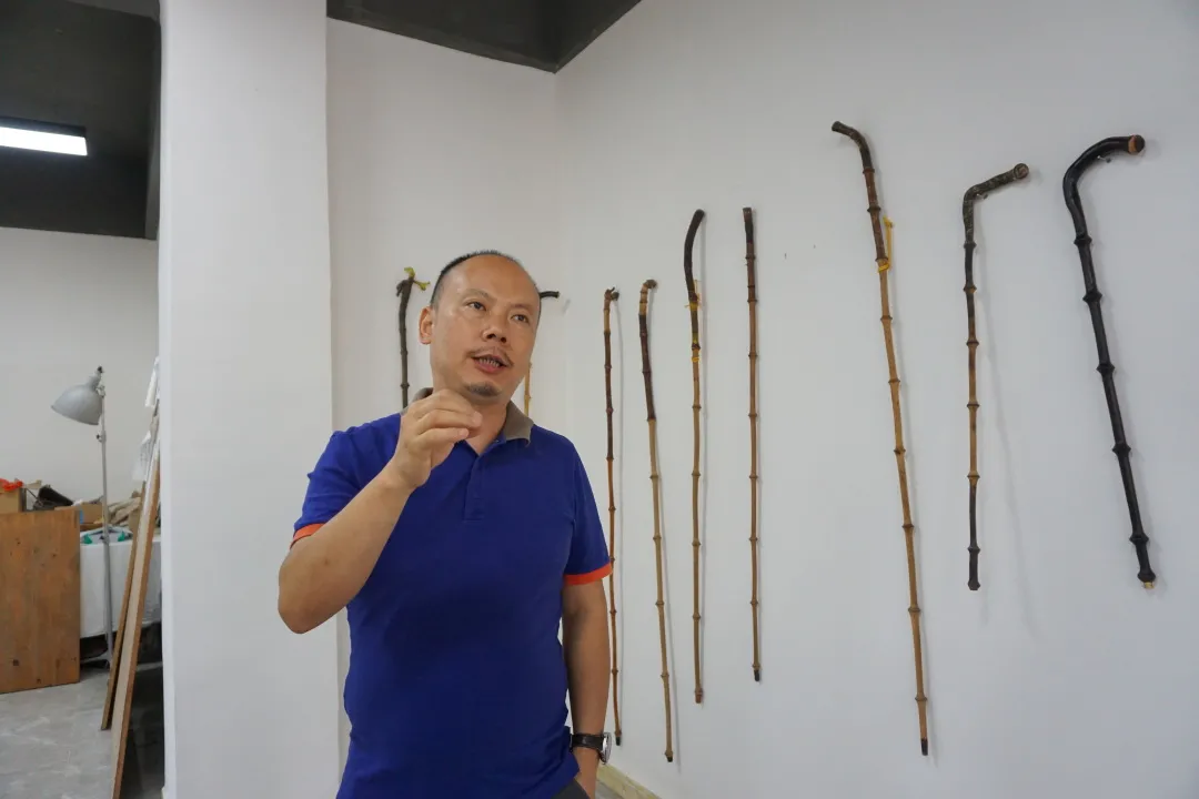“我們考證了歷史文獻(xiàn)上的圖形,按照古人的圖譜,通過加熱來做出彎曲的造型?!壁w彌指向固定在墻上的筇竹杖,介紹“筇竹杖”背后蘊含的文化及它在今時今日的意義,他詳細(xì)描述了筇竹杖漫長的制作流程,在正式制作前,要收集生長6年左右的竹子放在通風(fēng)陰涼的地方一年之久,來自然揮發(fā)掉內(nèi)部的水分糖分。