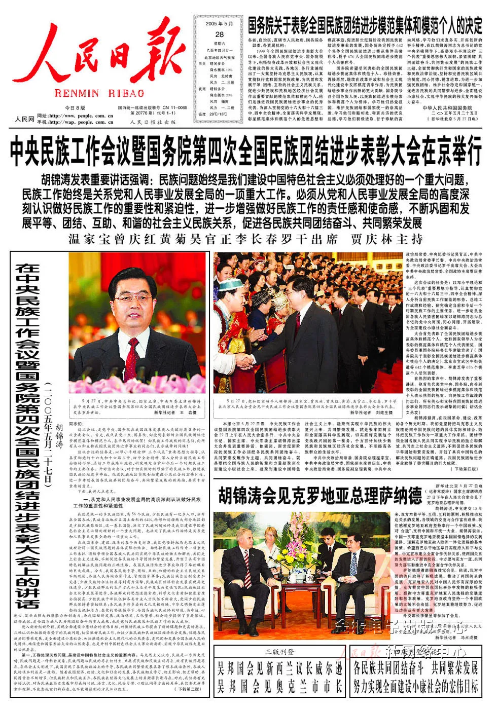 2005年5月27日至28日,第三次中央民族工作會議暨國務(wù)院第四次全國民族團(tuán)結(jié)進(jìn)步表彰大會在北京召開。