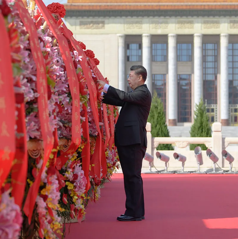2020年9月30日上午,黨和國家領導人習近平、李克強、栗戰(zhàn)書、汪洋、王滬寧、趙樂際、韓正、王岐山等來到北京天安門廣場,出席烈士紀念日向人民英雄敬獻花籃儀式。這是習近平整理花籃上的緞帶。新華社記者 申宏 攝