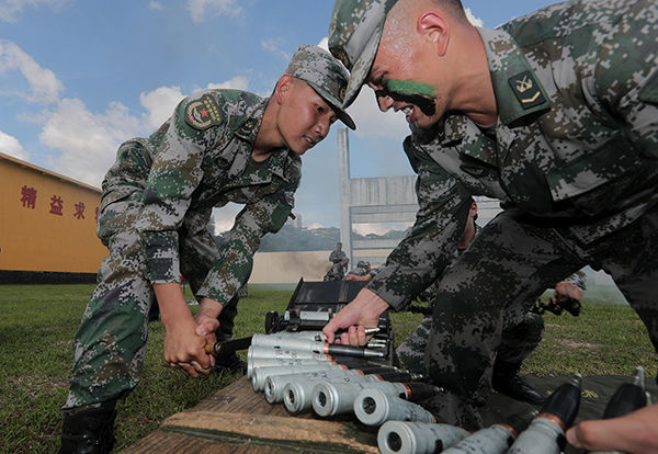 ↑駐香港部隊某旅裝步一連官兵裝填彈鏈(5月28日攝)。新華社發(fā)(易定 攝)